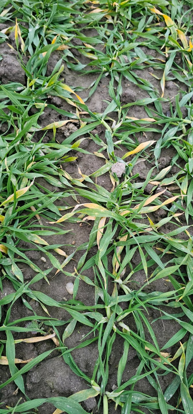 Dzisiaj byłem skontrolować jęczmień i ma przebarwienia, pożółkły bardzo od ostatniego razu. Ma też takie dziwne place jak od linijki wzdłuż żółte. Co może być przyczyną?