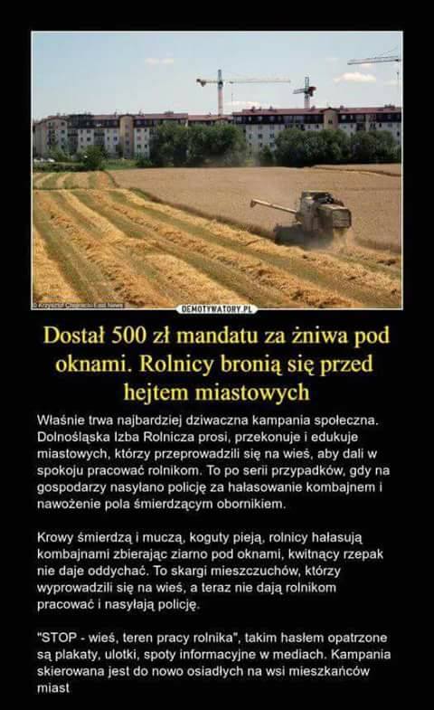 ale to nie są pojedyncze przypadki ;) w TPR nawet kiedyś było opisane kilka przypadków np. o suszarni która chodziłą po 22 i hałasowała ... i najlepsze bylo to że zgłości to jego sąsiad który jeszcze kilka lat wcześniej był rolnikiem .... mieli jakieś zebranie to baba wpadła na "pomysł" żeby młócili w deszczu bo wtedy się miej kurzy