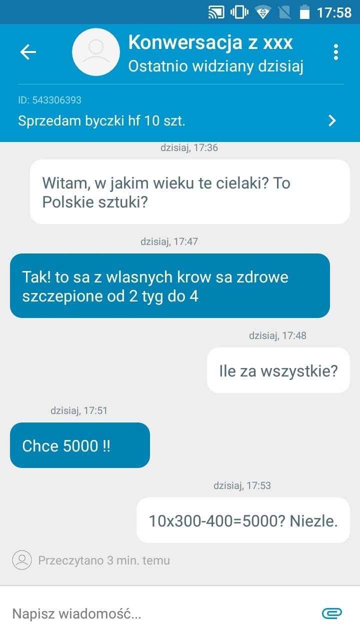 Do mnie jeszcze lepszy na dniach pisał z OLX , że potrzebne mu są moje dwie krowy (czarne mieszańce) do jego stada już teraz ale zapłaci w październiku czy listopadzie jak byki sprzeda bo tetaz są tanie...