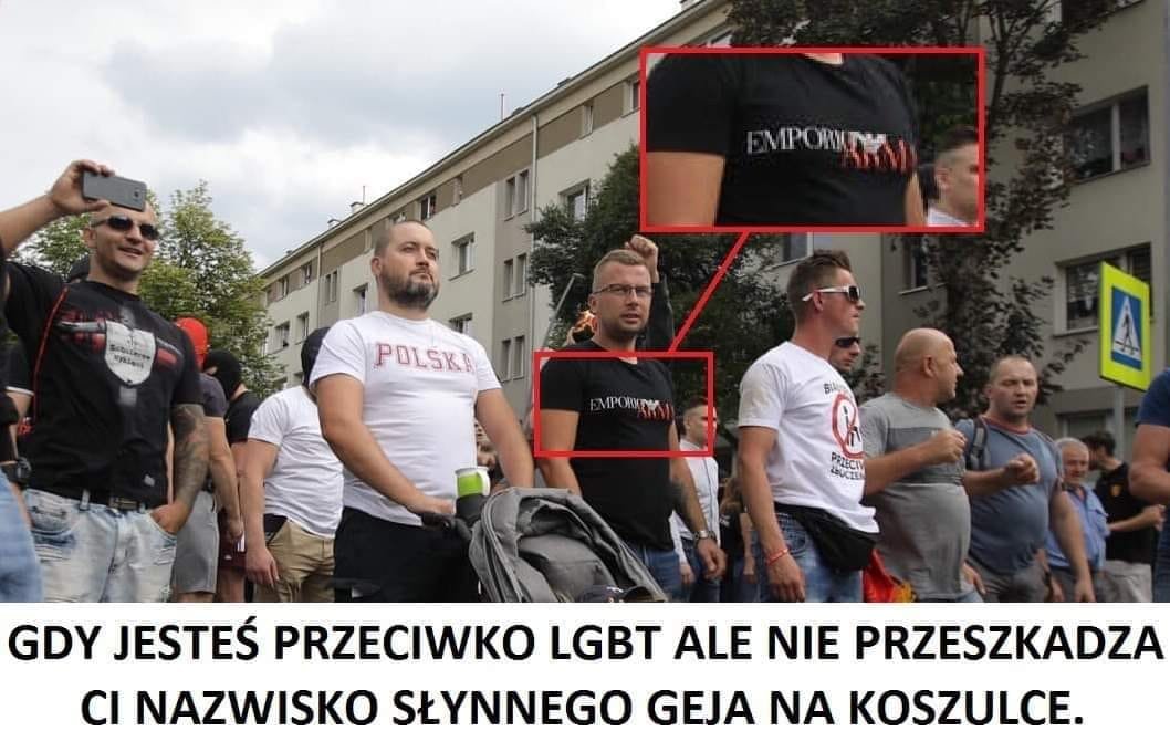 Wiesz przypominasz mi gościa z ostatniego protestu w Białymstoku  tego osiłka co szedł w anty proteście przeciwko lgbt  itp A sam na sobie miał koszulkę Armani czyli słynnego geja  😄
